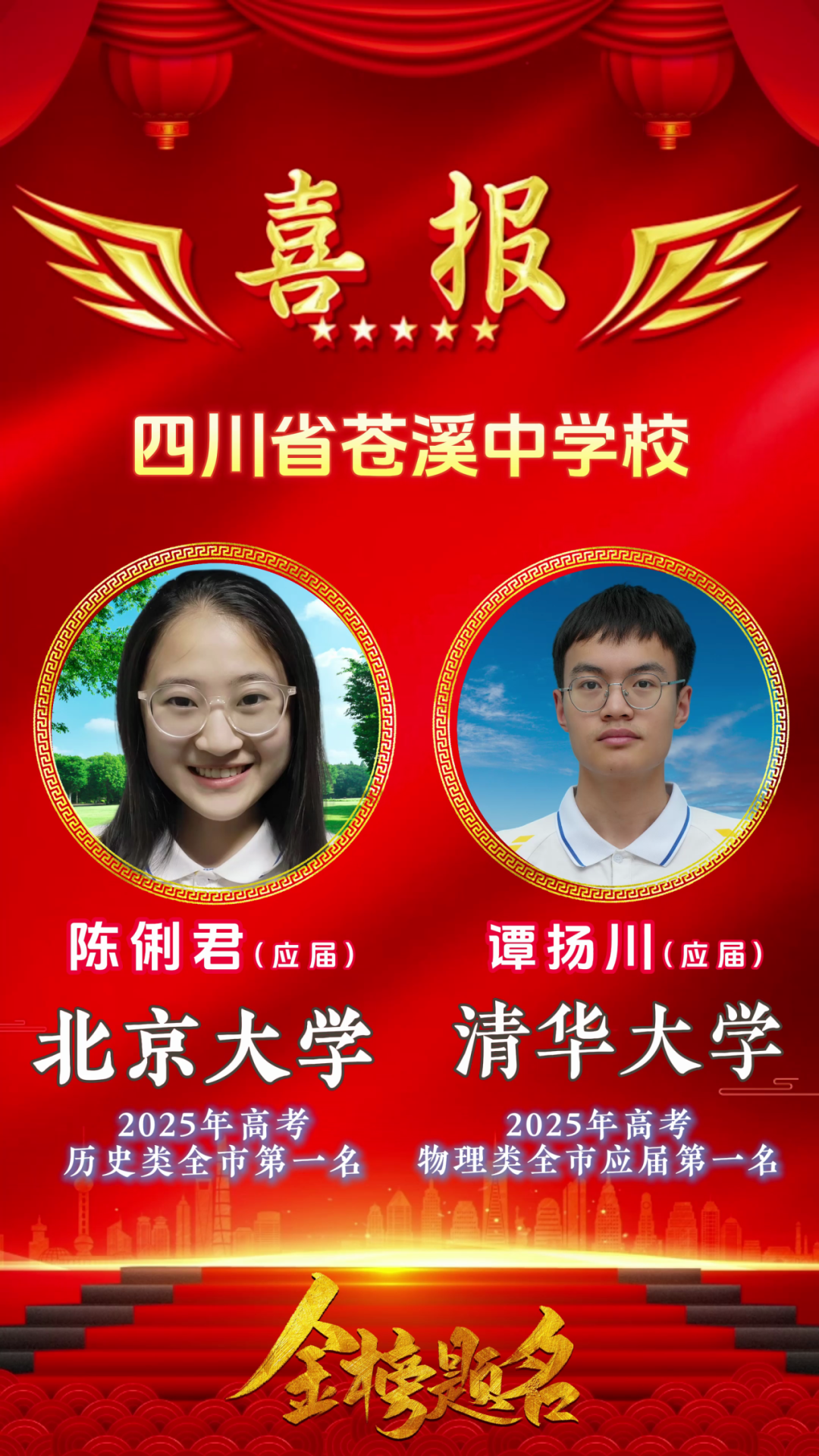 热烈祝贺我校陈俐君、谭扬川同学分别被北京大学、清华大学录取!